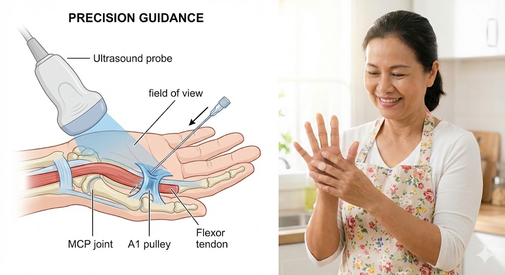 แต่เดี๋ยวนี้โลกการแพทย์เปลี่ยนไปแล้วครับ เรามีเทคนิคการรักษาที่แม่นยำ ปลอดภัย เจ็บน้อย และแทบไม่ต้องพักฟื้น นั่นคือ "การใช้เข็มสะกิดนิ้วล็อค โดยมีอัลตราซาวนด์นำทาง" (Ultrasound-Guided Percutaneous Needle Release)